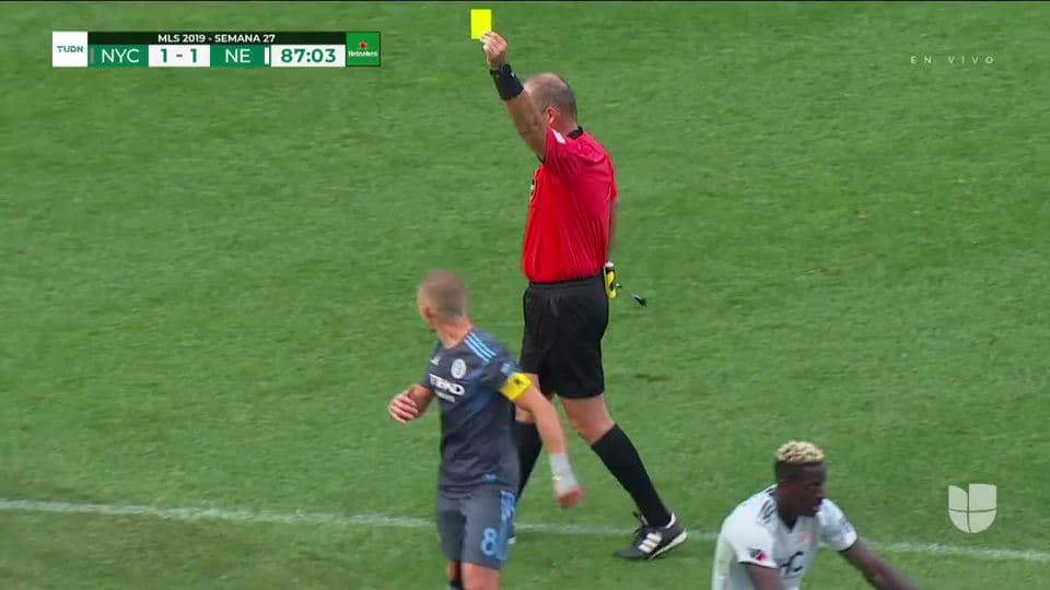 Tarjeta amarilla. El árbitro amonesta a Alexander Ring de New York City FC on September 7, 2019