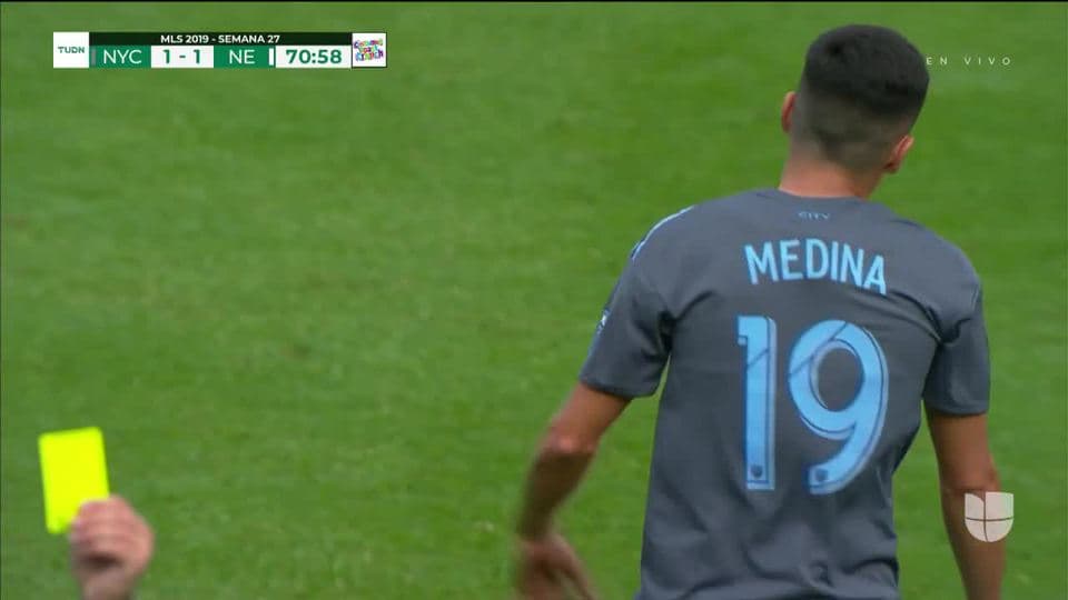 Tarjeta amarilla. El árbitro amonesta a Andrew Farrell de New England Revolution on September 7, 2019