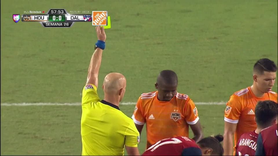 Tarjeta amarilla. El árbitro amonesta a Ãscar Boniek GarcÃa de Houston Dynamo