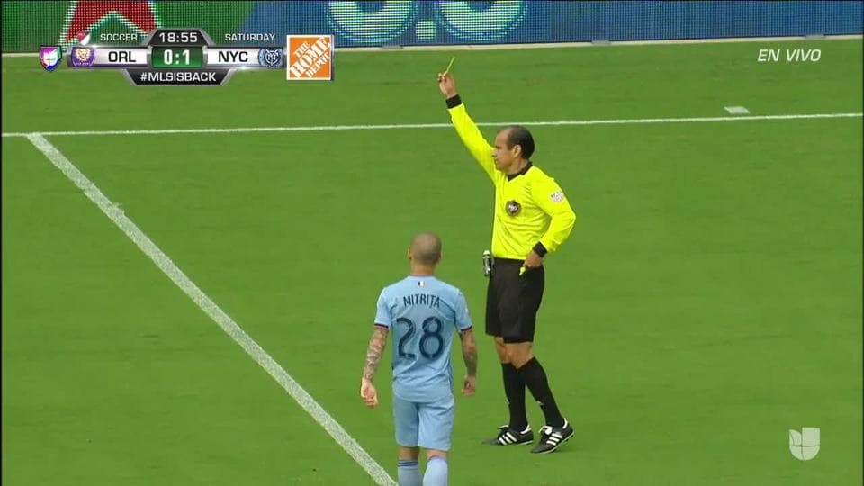 Tarjeta amarilla. El árbitro amonesta a Ben Sweat de New York City FC
