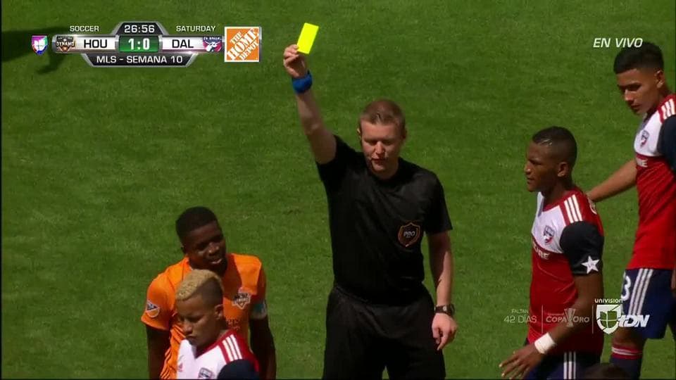 Tarjeta amarilla. El árbitro amonesta a Boniek García de Houston Dynamo