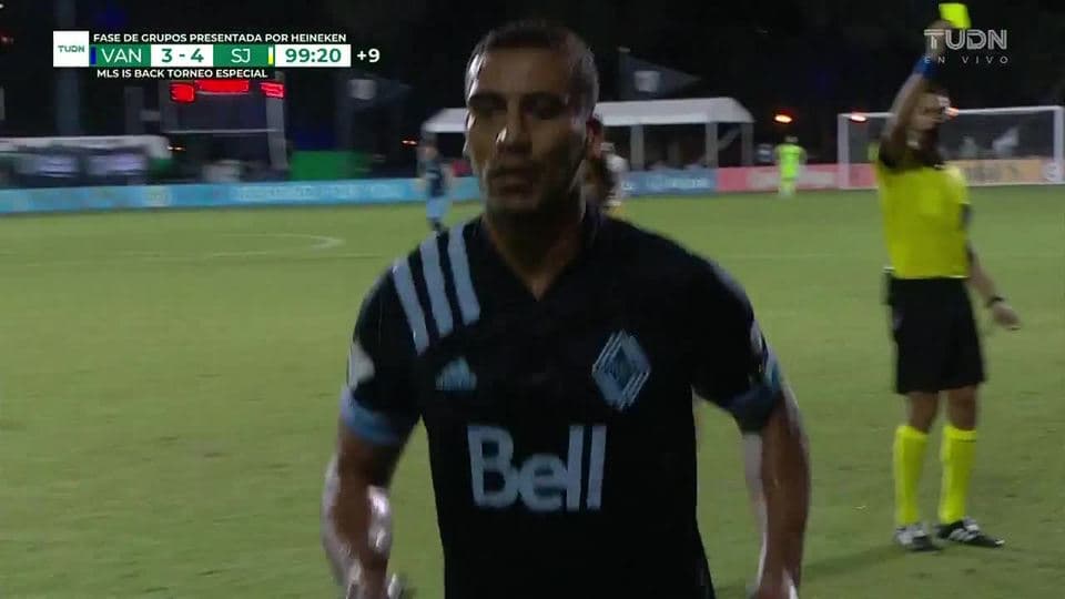 Tarjeta amarilla. El árbitro amonesta a Carlos Fierro de San Jose Earthquakes on July 15, 2020