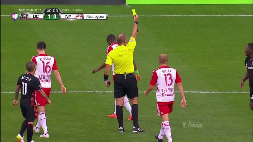 Tarjeta amarilla. El árbitro amonesta a Chris Duvall de New York Red Bulls