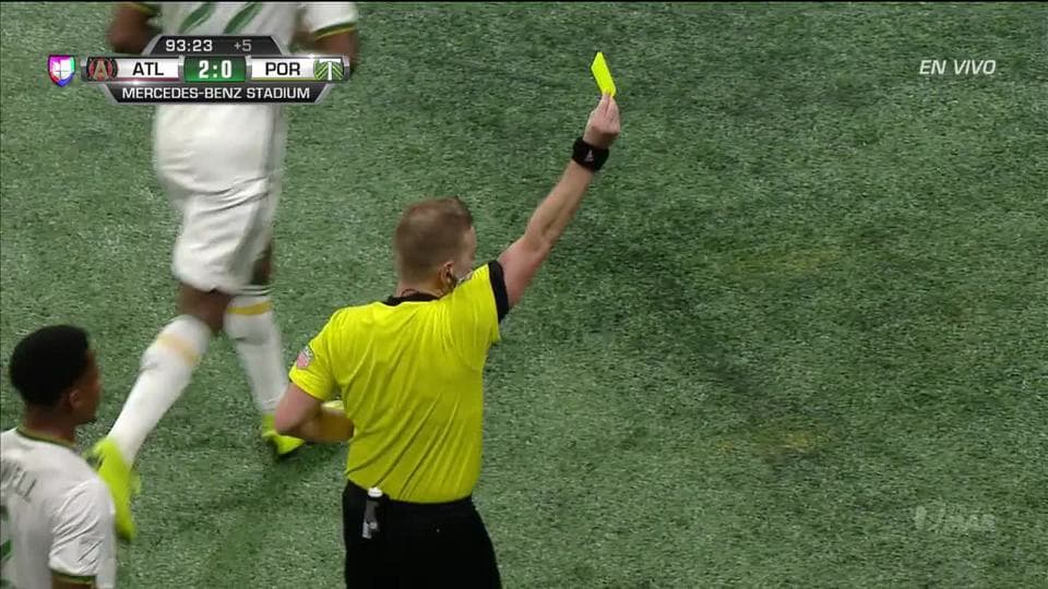 Tarjeta amarilla. El árbitro amonesta a Chris McCann de Atlanta United FC
