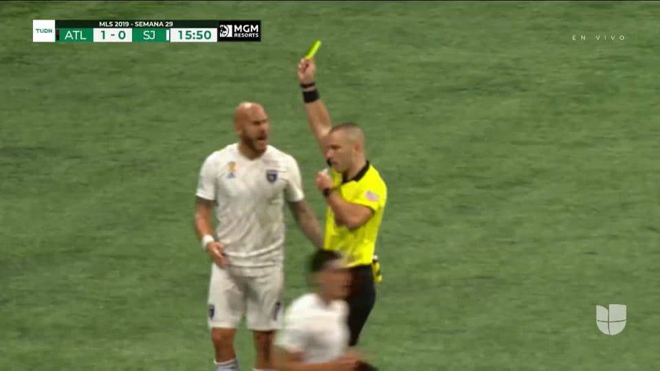 Tarjeta amarilla. El árbitro amonesta a Cristian Espinoza de San Jose Earthquakes