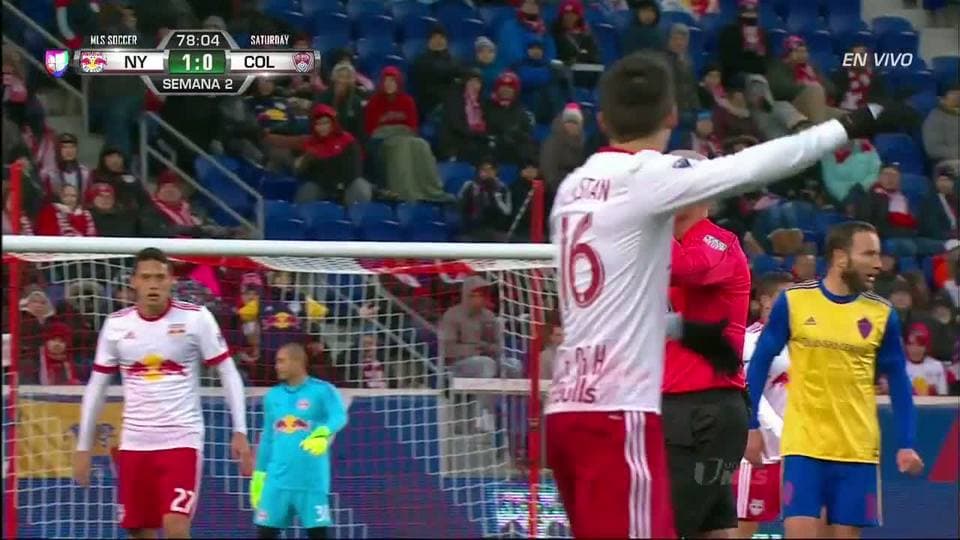 Tarjeta amarilla. El árbitro amonesta a Daniel Royer de New York Red Bulls