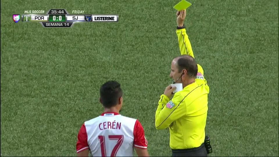Tarjeta amarilla. El árbitro amonesta a Darwin Cerén de San Jose Earthquakes