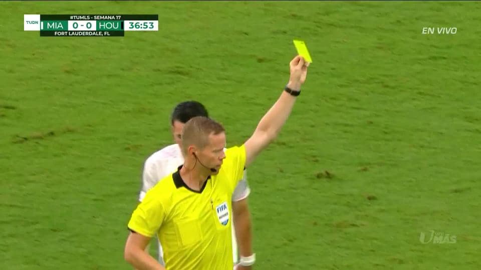 Tarjeta amarilla. El árbitro amonesta a Darwin Quintero de Houston Dynamo