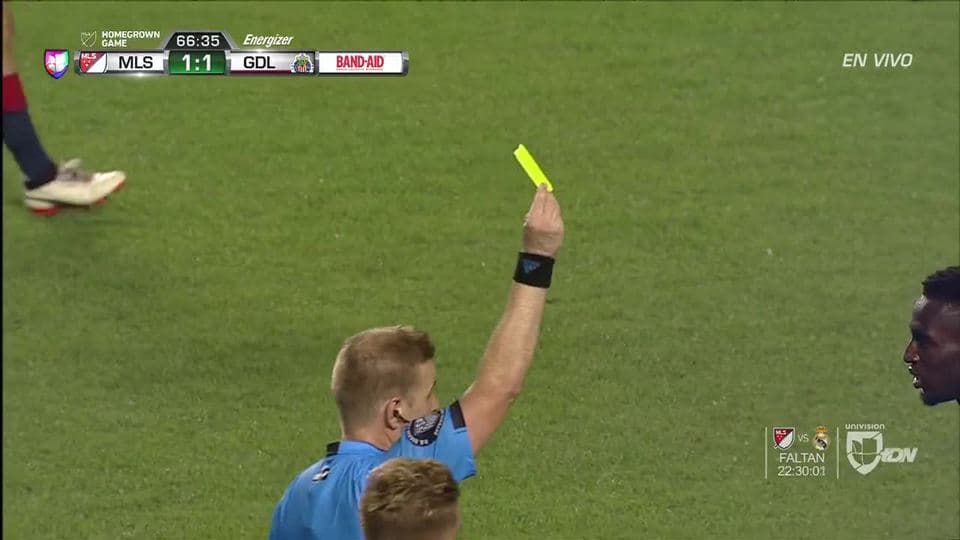 Tarjeta amarilla. El árbitro amonesta a Derrick Jones de MLS Homegrown Team
