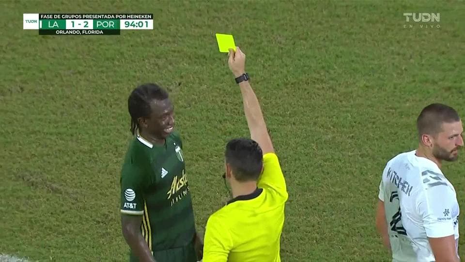 Tarjeta amarilla. El árbitro amonesta a Diego Chará de Portland Timbers on July 13, 2020