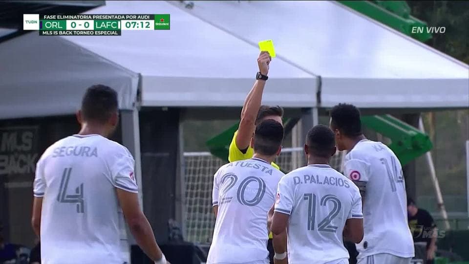 Tarjeta amarilla. El árbitro amonesta a Diego Palacios de Los Angeles Football Club on July 31, 2020