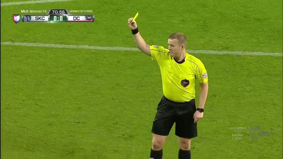 Tarjeta amarilla. El árbitro amonesta a Dominic Dwyer de Sporting Kansas City on May 27, 2016