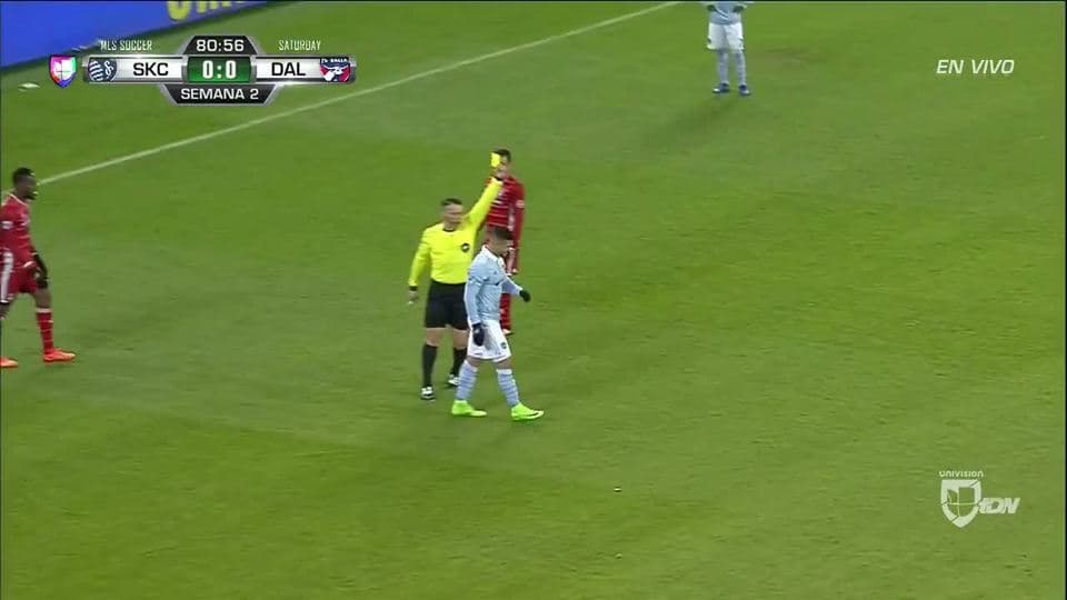 Tarjeta amarilla. El árbitro amonesta a Dominic Dwyer de Sporting Kansas City on March 11, 2017