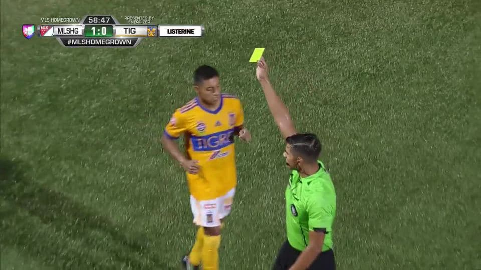Tarjeta amarilla. El árbitro amonesta a Efrain Alvarez de MLS Homegrown Team