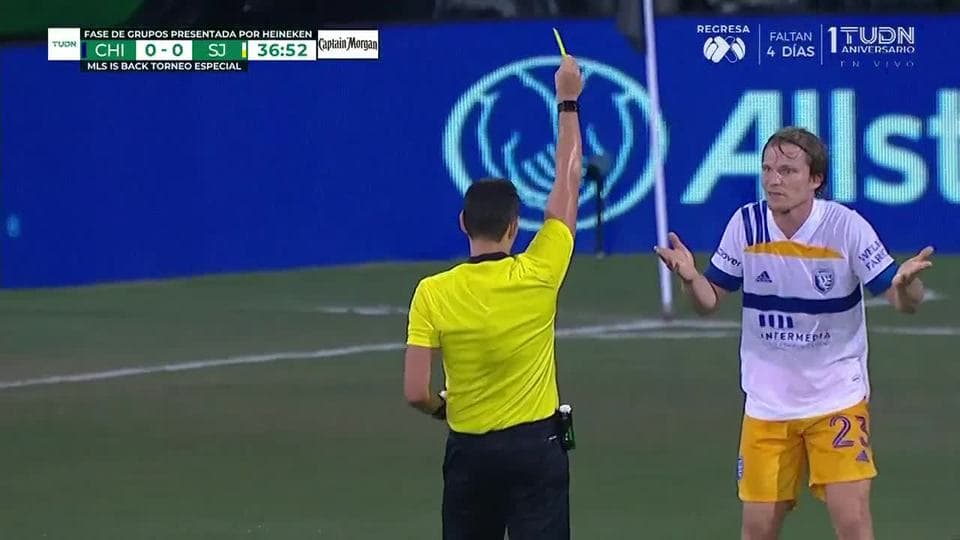 Tarjeta amarilla. El árbitro amonesta a Florian Jungwirth de San Jose Earthquakes on July 19, 2020