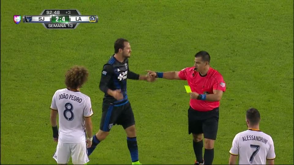 Tarjeta amarilla. El árbitro amonesta a Jack McInerney de LA Galaxy
