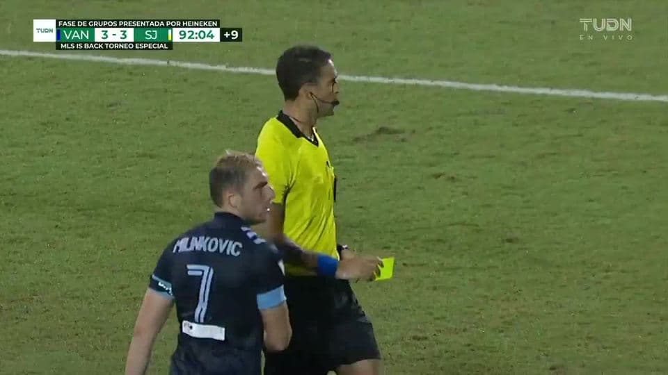 Tarjeta amarilla. El árbitro amonesta a Jackson Yueill de San Jose Earthquakes on July 15, 2020