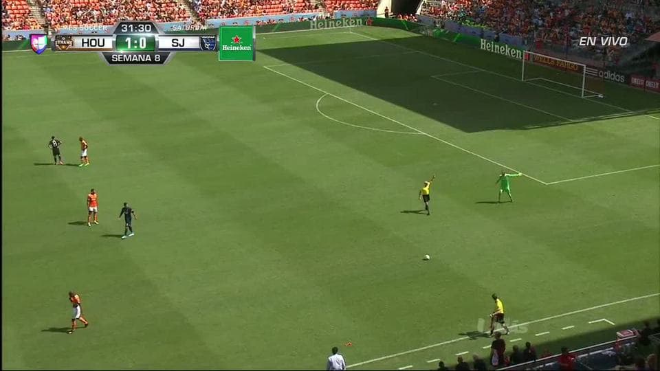 Tarjeta amarilla. El árbitro amonesta a Joe Willis de Houston Dynamo