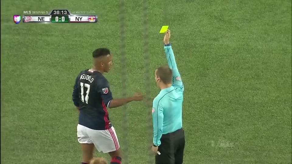 Tarjeta amarilla. El árbitro amonesta a Juan Agudelo de New England Revolution