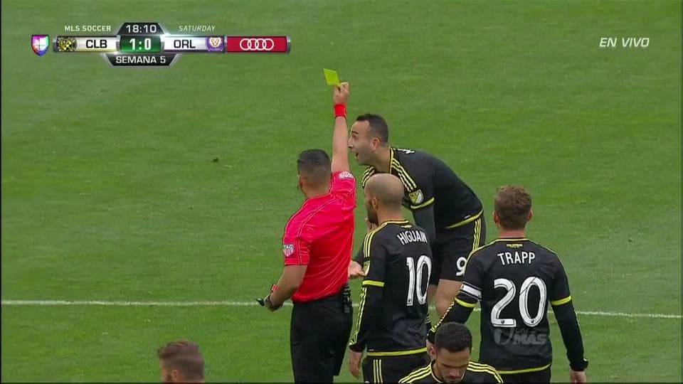 Tarjeta amarilla. El árbitro amonesta a Justin Meram de Columbus Crew SC