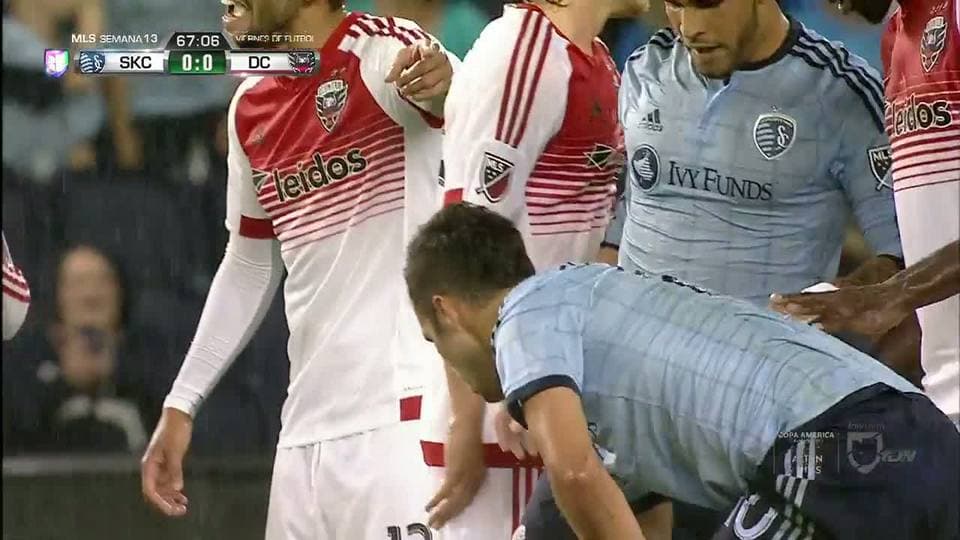 Tarjeta amarilla. El árbitro amonesta a Lamar Neagle de DC United on May 27, 2016