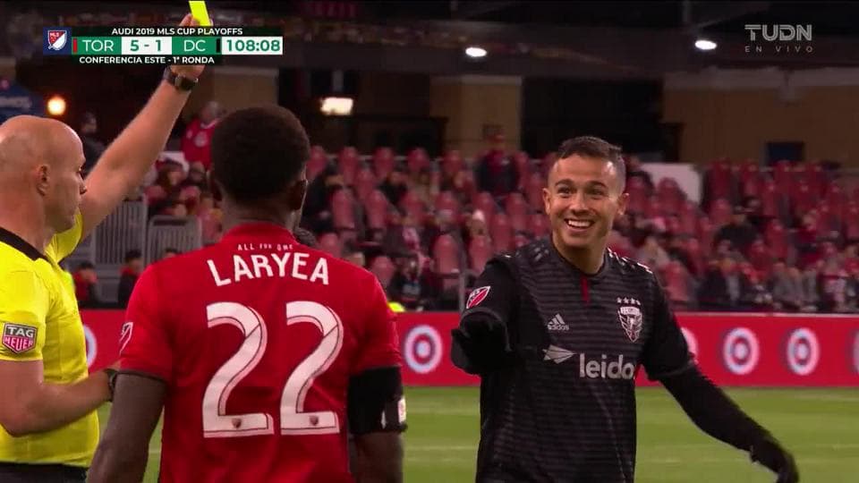 Tarjeta amarilla. El árbitro amonesta a Leonardo Jara de D.C. United