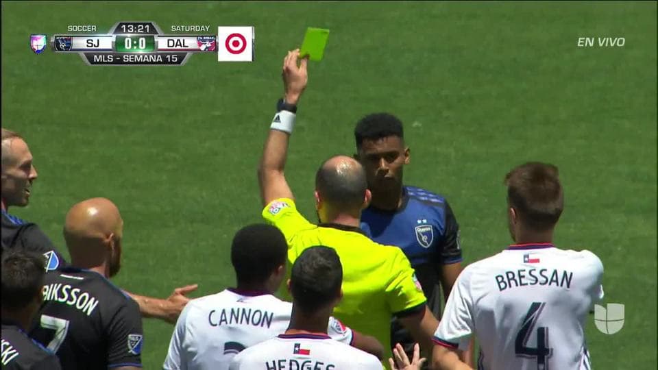 Tarjeta amarilla. El árbitro amonesta a Marcos López de San Jose Earthquakes