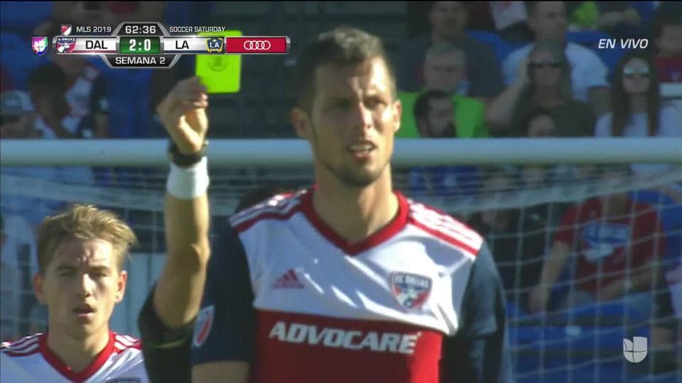 Tarjeta amarilla. El árbitro amonesta a Matt Hedges de FC Dallas
