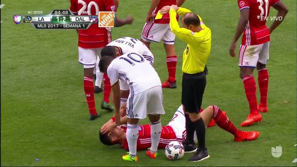 Tarjeta amarilla. El árbitro amonesta a Matt Hedges de FC Dallas