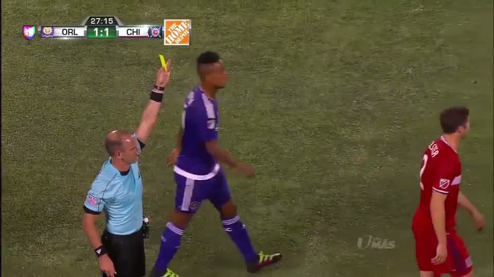 Tarjeta amarilla. El árbitro amonesta a Matt Polster de Chicago Fire