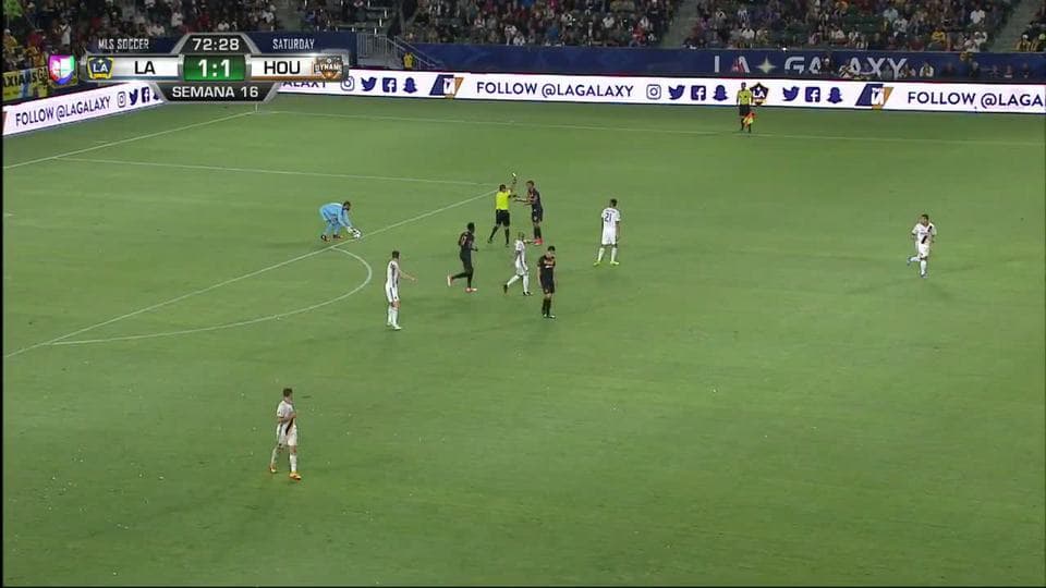 Tarjeta amarilla. El árbitro amonesta a Mauro Manotas de Houston Dynamo