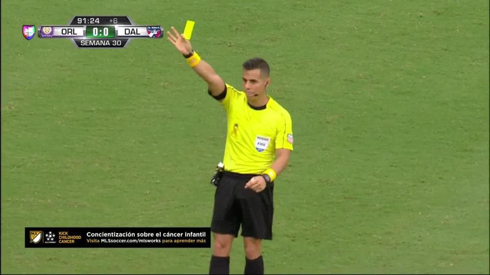 Tarjeta amarilla. El árbitro amonesta a Michael Barrios de FC Dallas