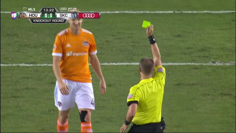 Tarjeta amarilla. El árbitro amonesta a Philippe Senderos de Houston Dynamo on October 26, 2017