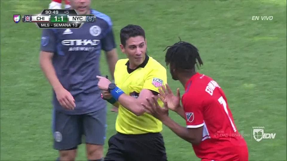 Tarjeta amarilla. El árbitro amonesta a Raheem Edwards de Chicago Fire on May 25, 2019