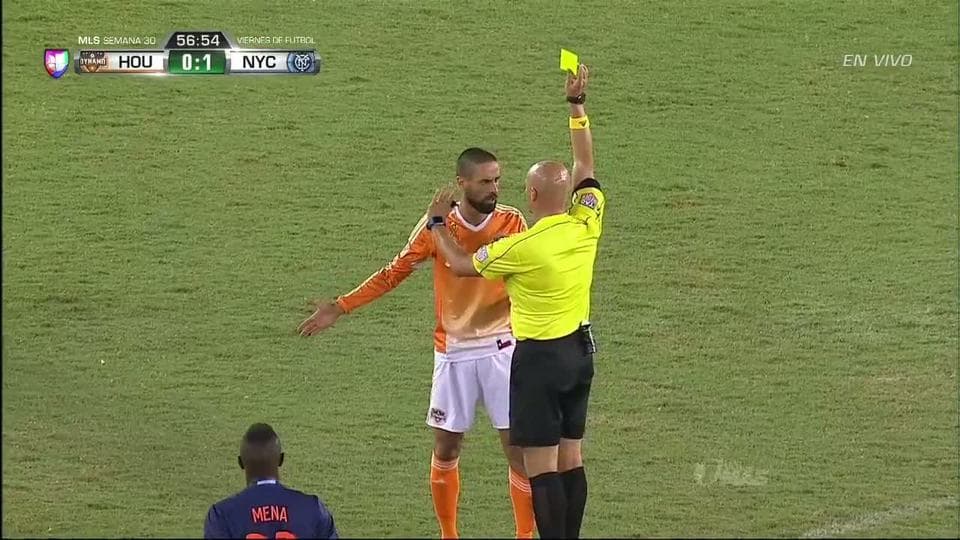 Tarjeta amarilla. El árbitro amonesta a Raúl Rodríguez de Houston Dynamo