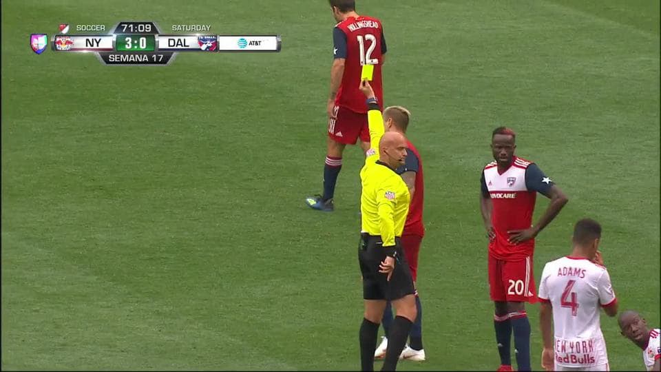 Tarjeta amarilla. El árbitro amonesta a Reto Ziegler de FC Dallas