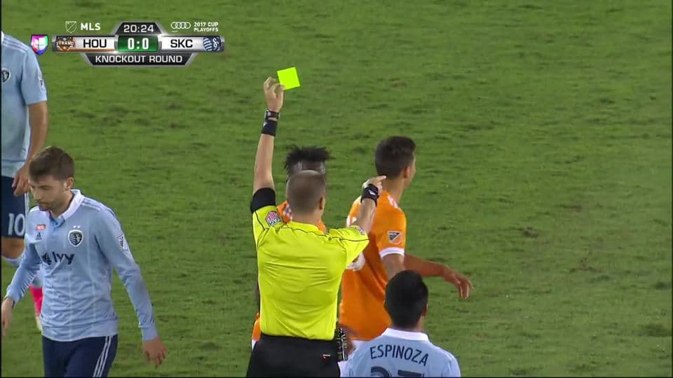 Tarjeta amarilla. El árbitro amonesta a Ricardo Clark de Houston Dynamo on October 26, 2017