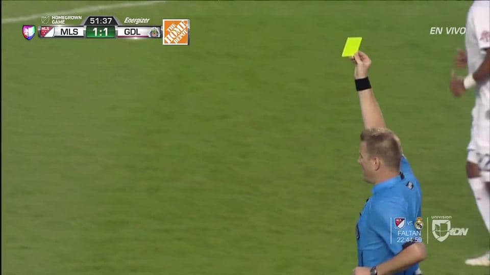 Tarjeta amarilla. El árbitro amonesta a Rubén Domínguez de Guadalajara U20