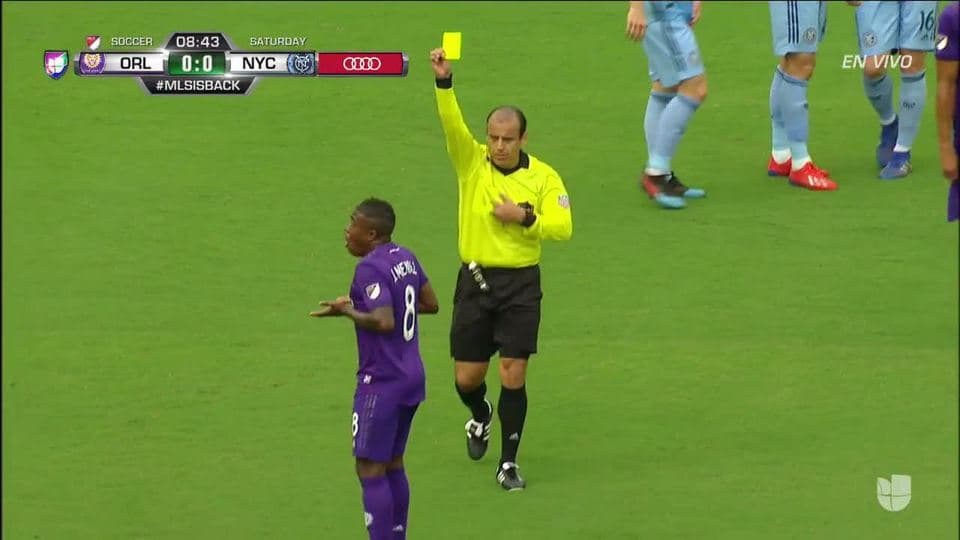 Tarjeta amarilla. El árbitro amonesta a Sebastián Méndez de Orlando City SC