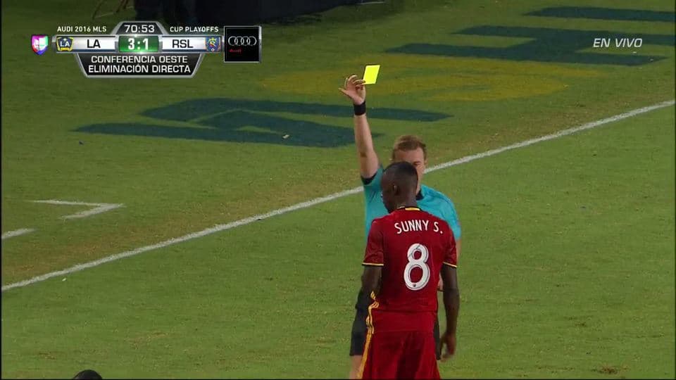 Tarjeta amarilla. El árbitro amonesta a Sunday Stephen Obayan de Real Salt Lake on October 26, 2016