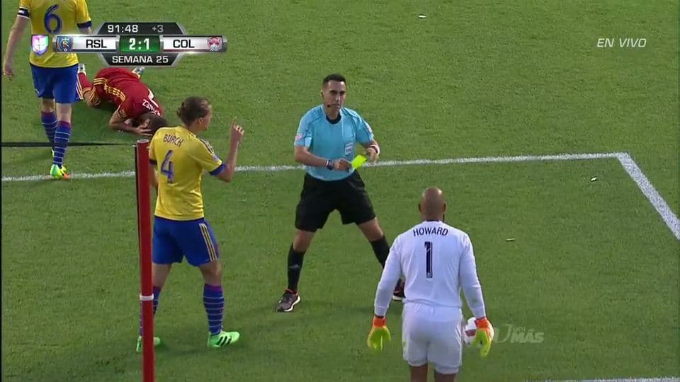 Tarjeta amarilla. El árbitro amonesta a Tim Howard de Colorado Rapids