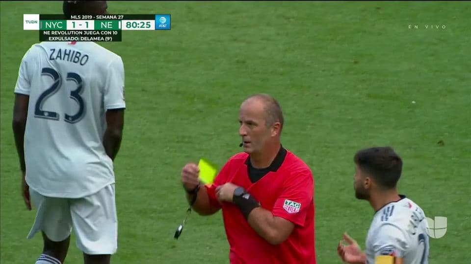 Tarjeta amarilla. El árbitro amonesta a Wilfried Zahibo de New England Revolution