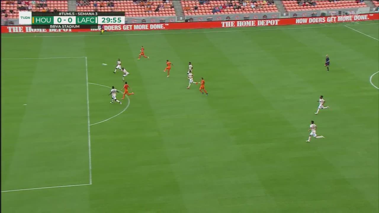 El jugador del Houston Dynamo ve el espacio y la manda muy por arriba de la portería de LAFC.