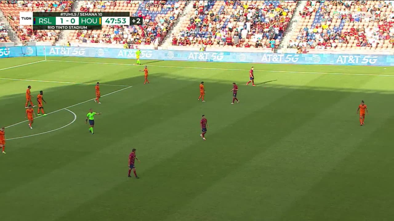 Tiro atajado. Aaron Herrera (Real Salt Lake) Disparo con la derecha desde el lado derecho dentro del área.