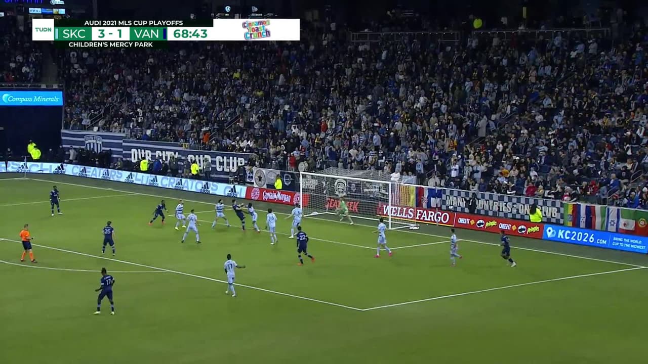 Tiro atajado. Brian White (Vancouver Whitecaps) disparo de cabeza desde el centro del área.