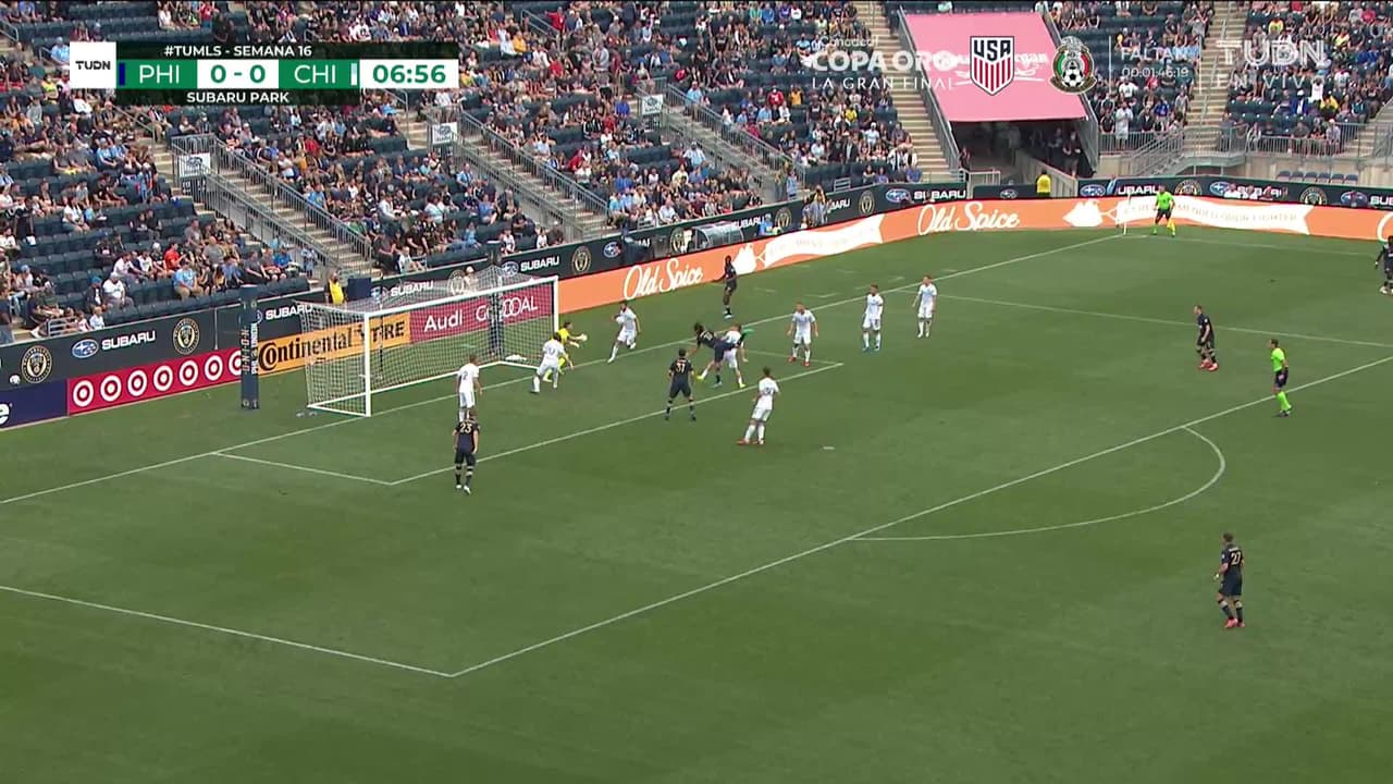 Tiro atajado junto al lado derecho de la portería. Cory Burke (Philadelphia Union) Disparo con la derecha sin ángulo desde la derecha.
