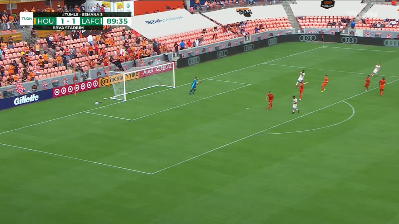 Tiro atajado junto al lado derecho de la portería. Danny Musovski (Los Angeles Football Club) Disparo con la derecha desde fuera del área.