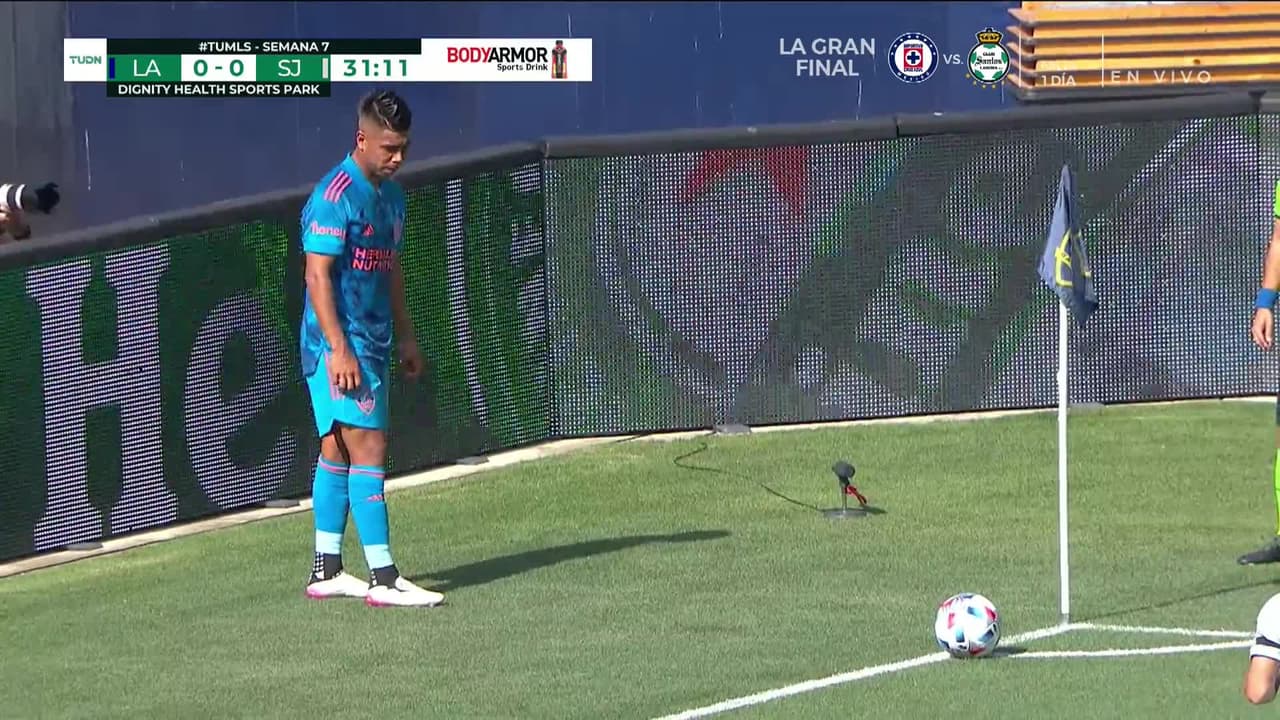 Tiro atajado junto al lado derecho de la portería. Efraín Álvarez (LA Galaxy) zurdazo desde el centro del área.
