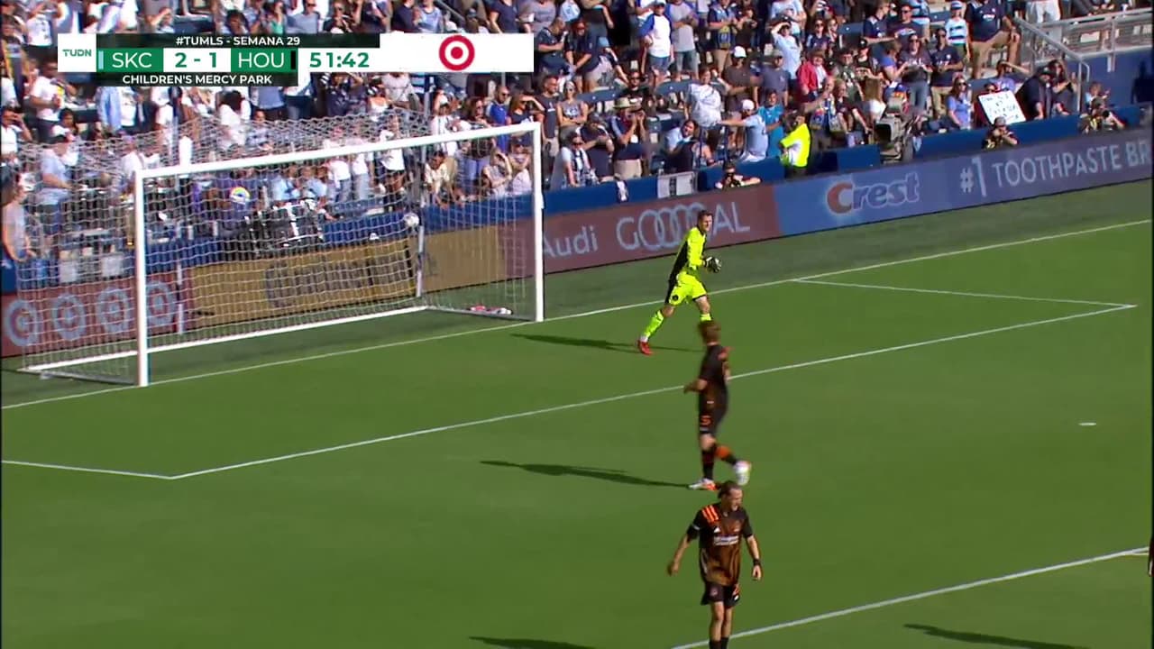 Remate parado junto al lado derecho de la portería. Gadi Kinda (Kansas City ) remate con la derecha desde fuera del área.