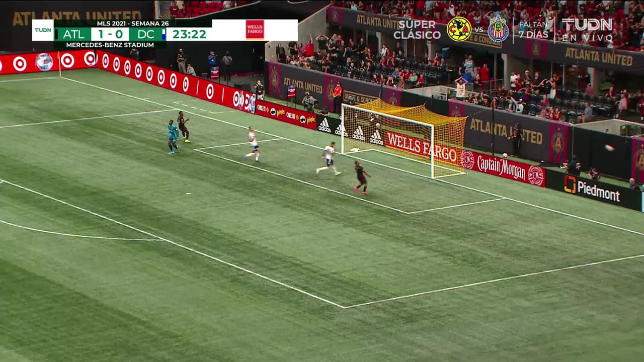 Tiro atajado raso al centro del arco. George Bello (Atlanta United FC) zurdazo desde el lado izquierdo dentro del área.